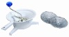 FK201 PLASTIC FOOD MINCER Material: 18/0 stainless steel + pp Size: Dia 23.5cm Parts: with 3 pcs stainless steel grater Pan color: white/red. Knob color: blue. MEAS/QTY:52.5*35.5*62/12SETS